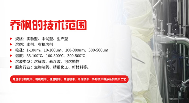 上海喬楓實業有限公司,成立于2012年,是從事噴霧干燥設備的研發設計、生產、銷售(小型噴霧干燥機實驗型噴霧干燥機,35℃低溫噴霧干燥機,有機溶劑噴霧干燥機低溫閉式循環噴霧干燥機超細粉末噴霧干燥機、噴霧冷凍干燥機、真空噴霧干燥機氣流噴霧干燥機,噴霧造粒干燥機,離心噴霧干燥機,沸騰制粒機等)和售后于一體的綜合性公司,本公司現成為一家致力于為生物制藥、精細化工、新能源、陶瓷造粒及食品工程等領域提供全套解決方案的整線交鑰匙工程企業。
